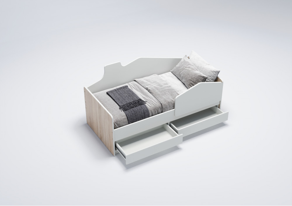 Особенностью этой кровати является задний борт, стилизованный под домик, что создает атмосферу увлекательной игры и фантазии для вашего малыша. Невысокая конструкция кровати обеспечивает безопасность и легкий доступ для ребенка.