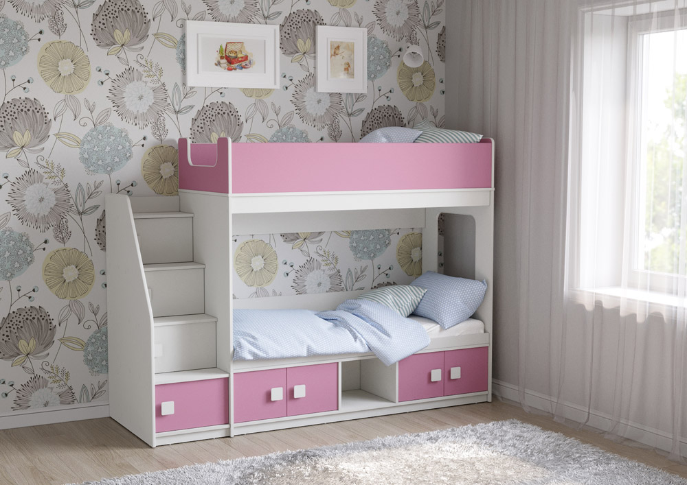 Классическая детская двухъярусная кровать с двумя параллельными спальными местами размером 1750х750 и 1900х750, закрытыми местами хранения и угловой лестницей-стеллажем.